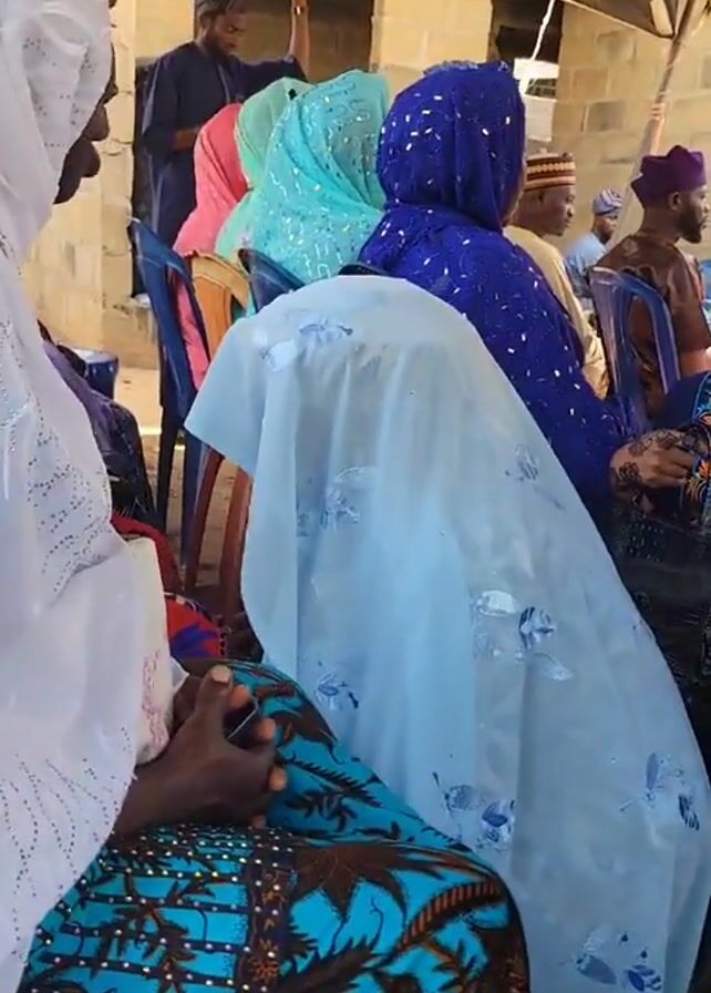 group of people sitting on blue plastic chairs under a temporary awning. The camera is mostly focused on the women, who are wearing colorful traditional clothing and head coverings in shades of blue, pink, and green. The women in the foreground have their hands clasped in their laps. Some men are also visible in the background wearing traditional headwear and clothing. A man stands in the background, holding a long stick. The setting appears to be outdoors, with a brick building visible in the background. There is music playing.