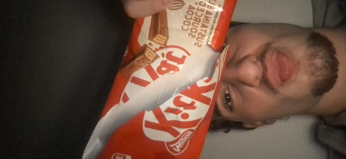 - "A person holds a Kit Kat bar, torn open, close to their face" by FM-Q0KF03, licensed under CC BY 4.0