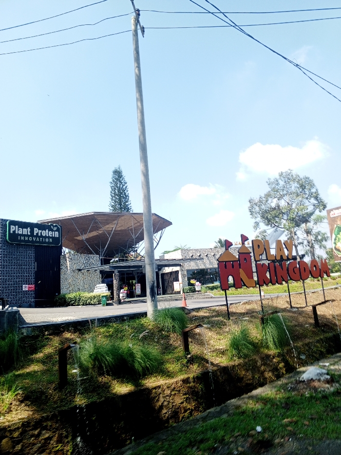 This daytime outdoor image depicts a commercial or recreational area in Multhan, India, under a clear sky with scattered clouds. In the foreground, a grassy embankment slopes into a rock-lined drainage ditch, where water streams from two exposed metal spouts. To the right, a large, multicolored sign in the shape of a castle and letters spells "PLAY KINGDOM." A prominent grey utility pole with overhead power lines stands centrally in the midground. Behind the ditch and pole, a paved entrance leads to a complex of buildings with stone facades and dark paneling. On the left, a sign reads "Plant Protein INNOVATION" vertically. A large, light-colored canopy with a visible support structure extends over the main entrance. A tall, slender coniferous tree is visible behind the canopy, and a large deciduous tree is present on the right side of the frame. An orange traffic cone and several smaller signs are visible near the building entrances. No individuals are clearly discernible.