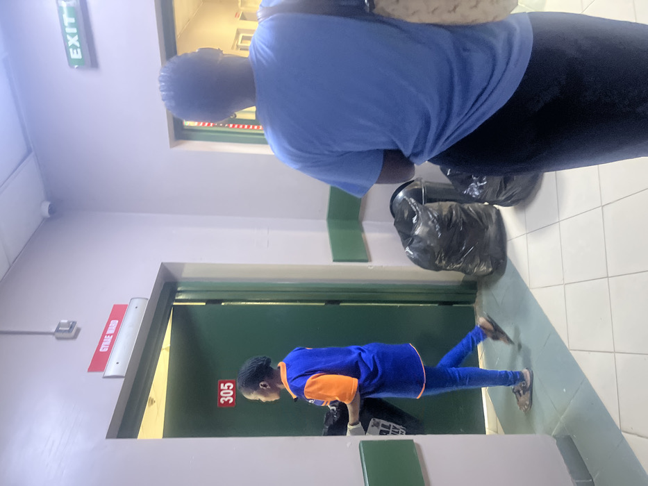 The image depicts an indoor scene within a hospital or clinic facility in Idimu, Nigeria. The environment features pale purple walls, a white tiled floor, and green protective strips mounted horizontally on the walls. In the mid-ground, a female individual in a blue and orange uniform, wearing white gloves and sandals, is seen emerging from a green doorway. She is carrying a large black plastic refuse bag with her right hand. Above this doorway, a red sign reads "GYNAE WARD," and red numbers "305" are affixed to the door itself, indicating a specific room or ward. In the foreground, another female individual stands with her back to the camera, wearing a blue t-shirt and a dark skirt. She appears to be observing the scene or waiting. To her left, near the wall and the green doorway, two full black plastic refuse bags are placed on the floor beside a silver-colored trash bin. Further into the background, to the right, another doorway with an illuminated green "EXIT" sign above it is visible, leading to a brightly lit hallway. A security camera is mounted on the ceiling in the upper right quadrant of the image. The overall lighting suggests an indoor, artificial light source.