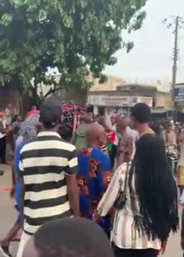 large crowd of people gathered on a street, looking in one direction. There are several trees visible, with buildings in the background. Many people are standing, some walking, and the crowd seems to be reacting to something out of frame. A few individuals stand out, including one in a striped shirt and another in a blue shirt with the word "Medic" on it. A red bicycle is also visible near the crowd.