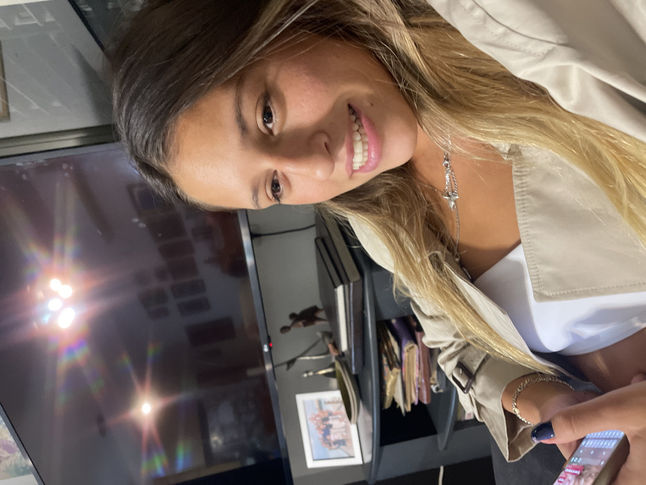 Location: Unknown, Unknown. A young adult female is depicted indoors, seated, and looking downward to her left, possibly at a smartphone held in her left hand. She has light brown hair with blonde highlights, a tan complexion, and is smiling with her teeth visible. She wears a light-colored, possibly beige, trench coat over a white top. A silver multi-layered necklace with a charm is visible on her chest, and a silver bracelet is on her left wrist. Her fingernails are painted dark blue. The background features a large, dark flat-screen television screen displaying significant reflections of overhead artificial lights, resulting in distinct lens flare artifacts. Reflected in the television are what appear to be framed pictures on a wall. Below the television is a dark-colored, multi-tiered shelf unit. On the top tier, from left to right, are a white-framed photograph of a group of people, a metallic decorative object, a small dark statuette, and a stack of dark-bound books or notebooks. A lower tier of the shelf unit holds additional stacked books or papers. The overall environment suggests a domestic setting.