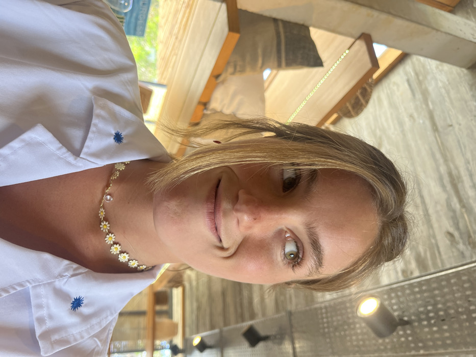 A close-up indoor portrait depicts a light-skinned female with light brown hair, partially swept back, and green-hazel eyes. She displays a slight smile and looks upwards and to her right. A small reddish mark is present on the bridge of her nose. She is wearing a white collared shirt adorned with small blue star-shaped embroidery on each collar tip. A choker-style necklace is visible, featuring a series of small white daisies with yellow centers, interspaced with clear beads and a prominent clear teardrop-shaped gem. A faint red earring is visible near her left ear. The background shows an interior setting with a raw concrete ceiling featuring exposed metallic ducts and two black cylindrical spotlights, one illuminated. To the left, wooden shelving holds light-colored cushions. A blurred outdoor scene with greenery and partial white text is discernible through an opening on the lower left. The location is Faro de José Ignacio, Uruguay.