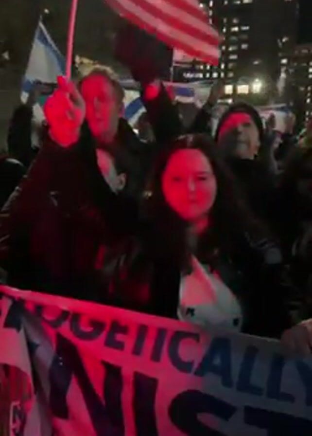 A crowd of people is gathered at night, illuminated by red lights. Several people are waving American and Israeli flags. A banner with the word "ZIONIST" is visible. The letters "NYPD" are also partially visible.