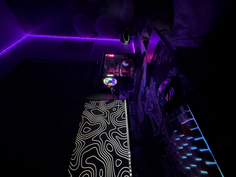 The scene is an interior room located in Dimitrovgrad, Bulgaria, characterized by a dark environment illuminated by various artificial light sources. A computer workstation occupies the central foreground and midground. A large, dark monitor displays a black background patterned with intricate white contour lines. To the right of the monitor, a transparent-sided personal computer (PC) tower exhibits internal multi-color RGB lighting, prominently featuring a circular, illuminated fan on its front, displaying red, pink, purple, green, and blue hues. The dark desk surface is covered by a large mouse pad that features purple-illuminated graphic designs. A compact mechanical keyboard with white keycaps is backlit with blue-cyan light and is positioned on the left side of the desk. To its right, a dark gaming mouse shows internal RGB lighting in purple, pink, and blue tones. A white remote control is situated on the desk between the monitor and the PC tower. The room's ambient illumination includes a strip of bright purple LED lights running vertically along the wall and horizontally across the ceiling corner to the right of the PC tower. Several light-colored balloons are partially visible in the background against the wall. A pair of bright yellow-green tinted goggles or headwear rests near the balloons on the right. No individuals are present in the image, and no active interactions or specific actions are depicted.