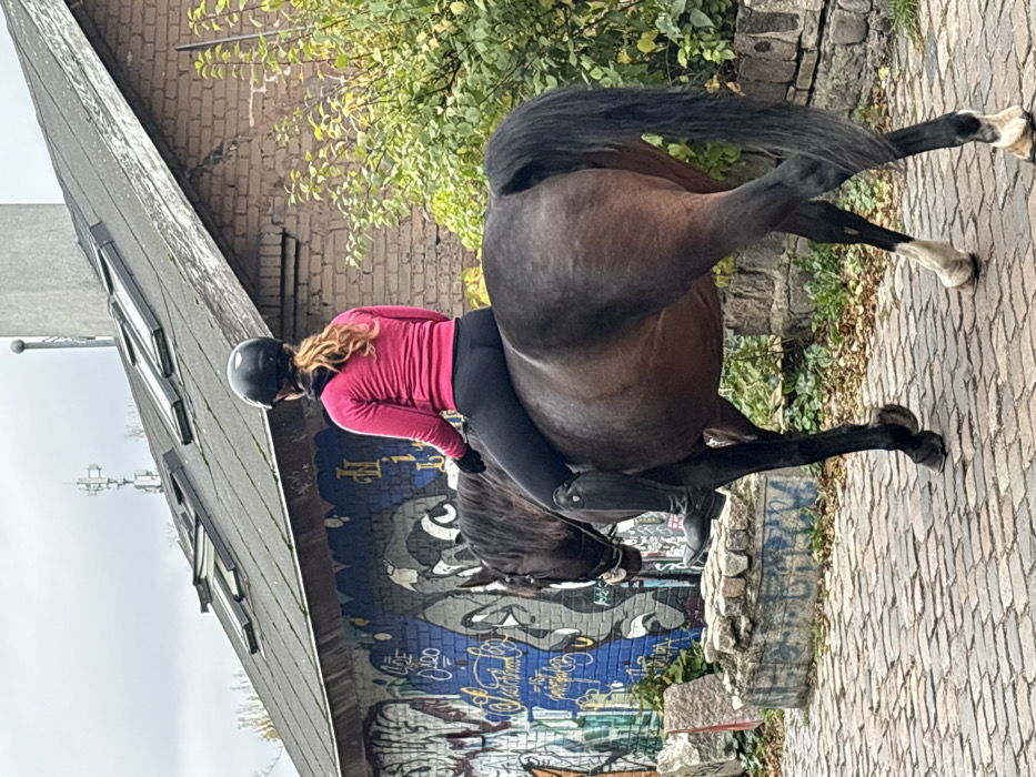 A female individual is depicted riding a dark brown/bay horse on a cobblestone path