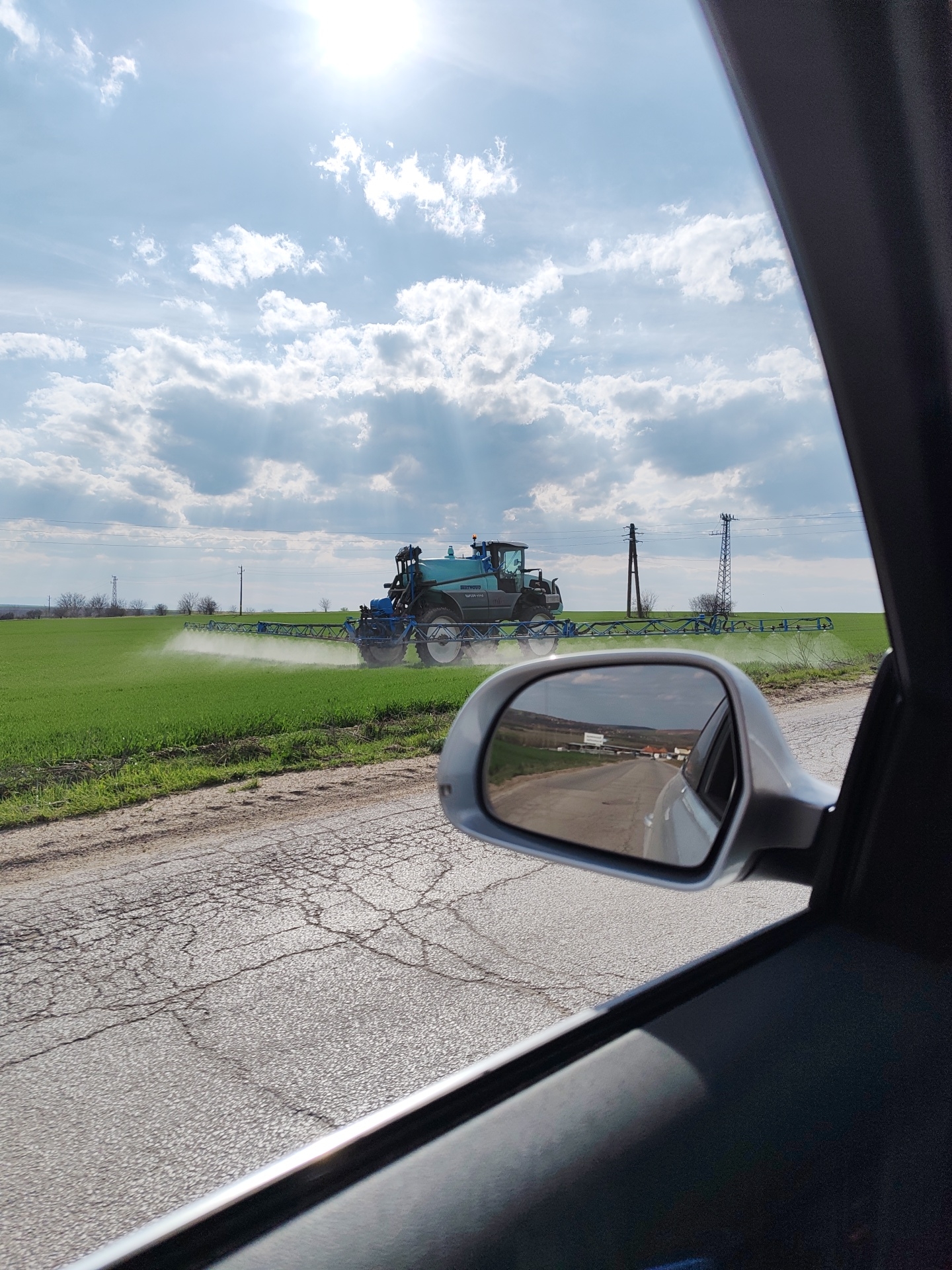 The scene is observed from the interior of a vehicle in the vicinity of Sofronievo, Bulgaria, looking forward and to the left. A teal and blue self-propelled agricultural sprayer, identified by visible text as a Berthoud model, is actively operating in a large, cultivated green field. The sprayer's wide, horizontal booms are extended, discharging a fine white spray onto the crops. The foreground features a cracked asphalt road adjacent to the field. In the mid-ground, several utility poles with power lines are visible, extending towards a distant, low-lying horizon. The sky is partly cloudy, displaying patches of blue amidst cumulus clouds, with bright sunlight emanating from the upper right, casting visible rays. The silver-colored passenger side mirror of the viewing vehicle occupies the lower right quadrant, reflecting the cracked asphalt road receding behind, along with distant hills and a small cluster of buildings. No individuals are visible in the immediate scene or the reflection.