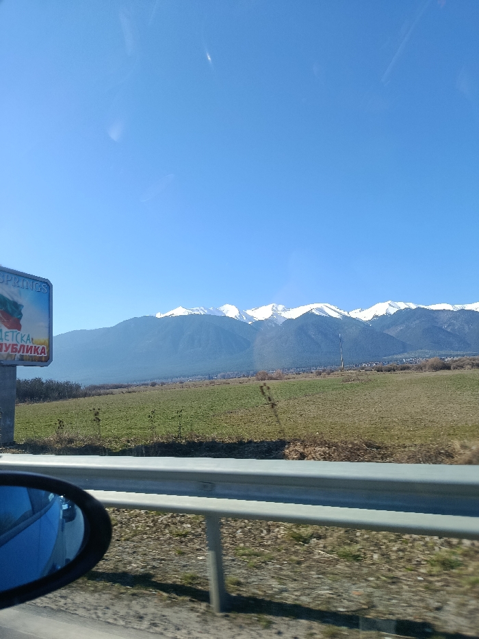 The image captures a panoramic view of a rural landscape near Razlog, Bulgaria, observed from the interior of a moving vehicle on a clear day. In the immediate foreground, the top section of a silver-grey metallic guardrail extends horizontally across the lower third of the frame. To the bottom-left, a black, oval-shaped vehicle side mirror is partially visible, reflecting a blue vehicle body. The ground directly adjacent to the guardrail is rough, comprising brown earth and sparse, dry vegetation. Midground elements include expansive agricultural fields displaying a mosaic of vibrant green vegetation and patches of exposed brown soil. On the left side of these fields, a light blue-bordered billboard stands vertically. The billboard features the partial English word "SPRINGS," a segment of the Bulgarian flag (white, green, red stripes), and Cyrillic text reading "ДЕТСКА РЕПУБЛИКА" (Children's Republic). A faint, elongated shadow extends diagonally across the fields from left to right. The background is dominated by a majestic range of mountains, likely the Pirin Mountains, with their lower and mid-slopes appearing dark blue-green, indicating dense forestation. The peaks of these mountains are distinctly covered in white snow. At the base of the mountains, beyond the fields, a scattered settlement with low-rise buildings is faintly visible, consistent with the town of Razlog. The sky above is a uniform, clear, bright blue, devoid of clouds, and indications of reflections or smudges are present on the vehicle's windshield. No individuals or active subjects are discernible within the scene.