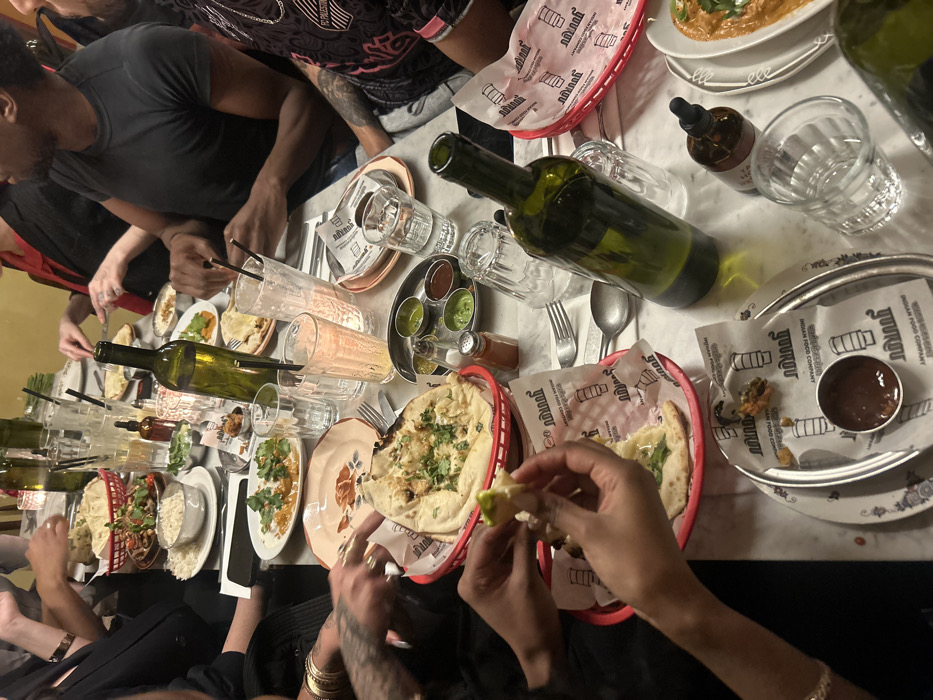 - "The image displays an elevated perspective of a group of approximately six to eight individuals dining at a long, light-colored table within the ANANND Indian Food Company restaurant in Paris, France" by FM-NklVs2, licensed under CC BY 4.0