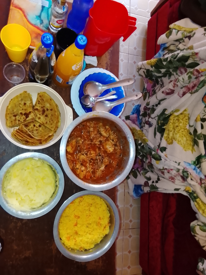 The image displays an indoor scene within Kiambu Township ward, Kenya, featuring a prepared meal on a dark brown table