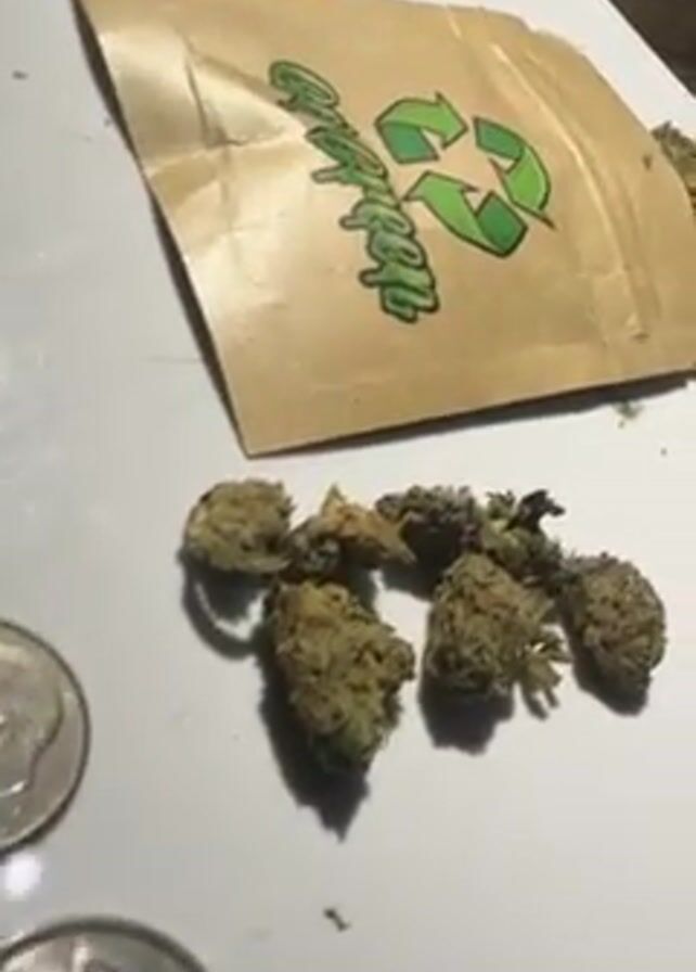 small, partially opened, brown paper bag with a green recycling symbol and the word "EcoPops" printed on it. Next to the bag are several small, irregularly-shaped green and brown buds, presumably cannabis. A US dime and a Canadian quarter are also visible on the white surface. The background is a blurry wood grain surface.