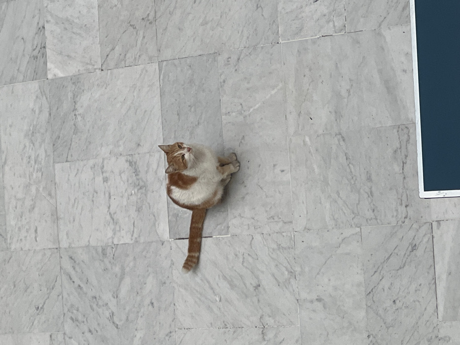 - "A ginger and white cat sits upright on gray-white tiled flooring" by FM-NiDCC3, licensed under CC BY 4.0