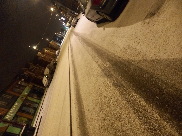 A snow-covered street at night, illuminated by streetlights. Cars are parked along the side of the road. Dark tire tracks are visible in the snow, stretching down the road. Buildings line the street, some with lit windows. The image is slightly tilted, creating a sense of perspective.