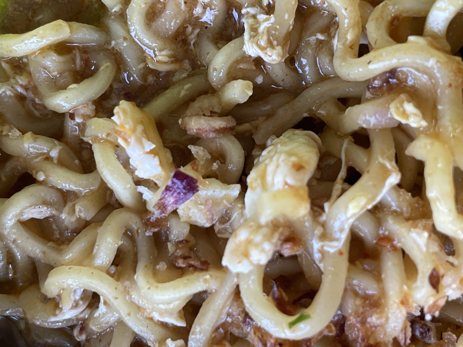 A forensic close-up image depicts a prepared dish of food, identified as being in Lhokseumawe, Indonesia. The scene is dominated by a dense arrangement of thick, wavy, light-beige noodles thoroughly coated in a glossy, viscous, reddish-brown sauce. Distributed throughout the noodles are irregular white clumps consistent with cooked scrambled egg or similar protein. Also interspersed are smaller, darker reddish-brown fragments, possibly fried shallots or chili flakes, with one prominent piece exhibiting a distinct reddish-purple hue, indicative of red onion or a similar ingredient. Minute green flecks, likely chopped herbs, are sparsely visible. No individuals, actions, or interactions are present within the frame; the focus is exclusively on the texture and components of the culinary item.