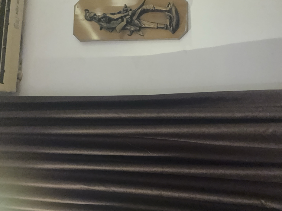 A section of a white wall hosts a framed piece of art depicting two figures engaged in combat, possibly wrestling or martial arts. Below the artwork, a dark, horizontally pleated curtain fills the lower portion of the frame. To the left, a portion of another frame is visible, with vertical lines suggesting text or graphics within. The overall impression is of a domestic setting, with art and textiles.