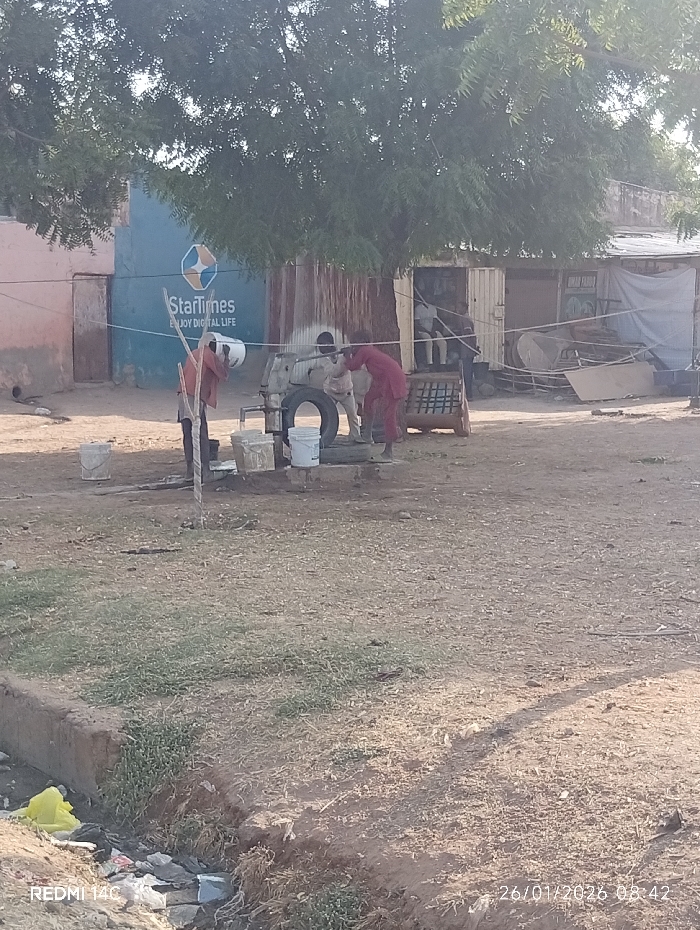 Three people are working around what appears to be a water pump or well, using buckets. One person is wearing red clothes, another is wearing beige, and the third is in the process of pouring water from a white bucket. A blue wall with the StarTimes logo is visible in the background. Behind the workers, there's a structure that may be a workshop with people standing in the doorway. The ground is dry and somewhat dusty. The image is dated 26/01/2026.