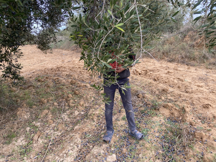An individual is depicted standing in an olive grove in الغنادة, Tunisia