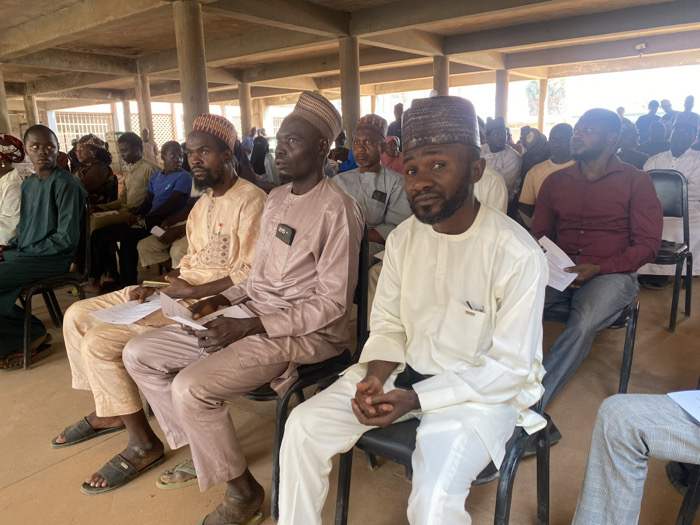 An image captured in the city of Hayin Banki, Nigeria, depicts approximately two dozen adult males, predominantly, seated in rows within a partially enclosed structure. The subjects are positioned on black metal-framed plastic chairs on a reddish-brown floor. The structure features concrete pillars and beams supporting a raw concrete ceiling. The background reveals additional attendees and outdoor light, indicating an open-sided construction. In the immediate foreground, a man wearing a cream-colored tunic and a brown patterned cap looks towards the camera. To his left, a man in a light purple tunic and cap holds white papers. Further left, another man in a light peach-colored tunic and cap also holds white papers. Multiple attendees are observed holding similar white documents. The individuals are generally oriented towards an unseen focal point, suggesting an assembly or meeting.