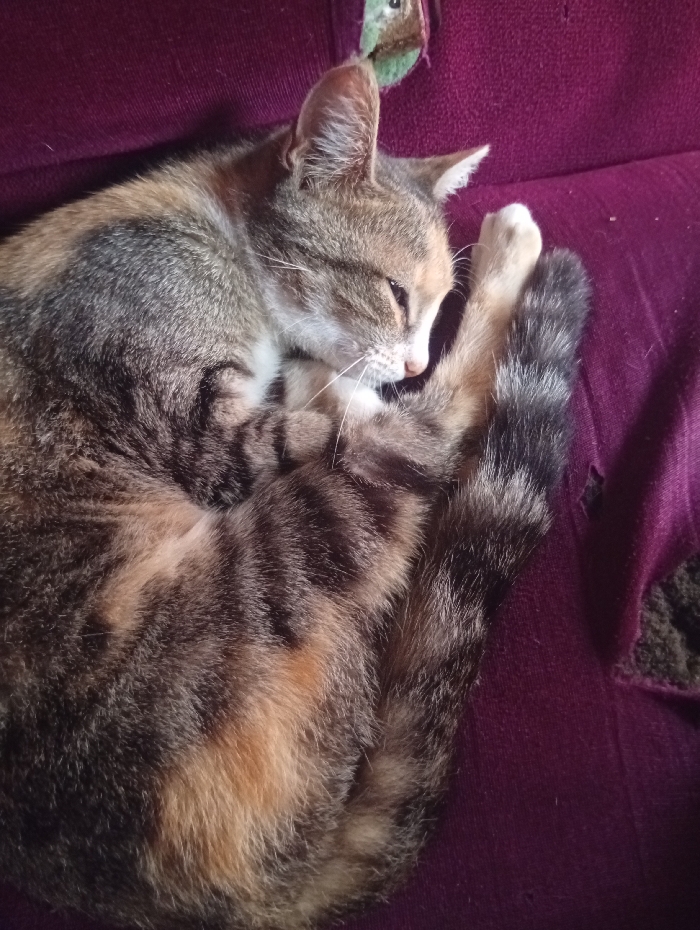 A curled-up cat rests on a purple surface. The cat's fur is a mix of brown, black, and orange, with distinct tabby markings. Its tail is wrapped around its body, and a paw rests near its face. The cat appears to be sleeping or at rest, with its eyes closed. The purple surface is textured, resembling a couch or cushion. There are signs of wear and tear on the fabric, with a tear on the right side.