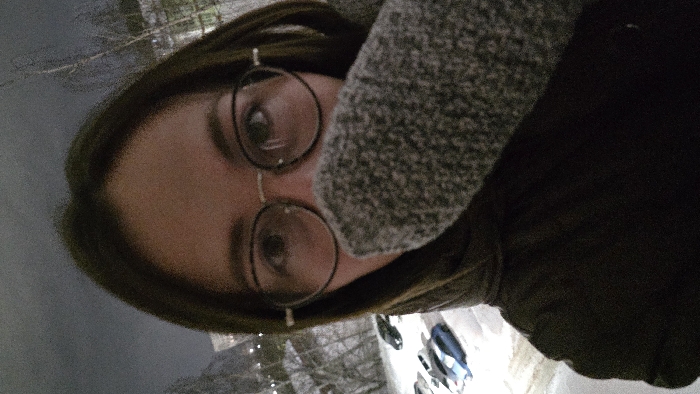 The image presents a selfie captured from an elevated position in Chaikovsky, Russia, during what appears to be a winter night. The primary subject is an individual, whose upper torso and facial features from the nose bridge upward are visible. The person has dark hair and wears thin, round-framed glasses. Their lower face, encompassing the mouth and chin, is obscured by a gray, textured fabric, consistent with a scarf or a large mitten. The individual is wearing a dark, possibly hooded, winter jacket. The background features a dark, overcast sky above a landscape extensively covered in snow. To the lower-left, a parking lot contains several vehicles, including blue and dark-colored cars, all dusted with snow. Beyond the parking area, bare trees and faintly illuminated distant buildings are discernible, characteristic of an urban setting during cold weather.