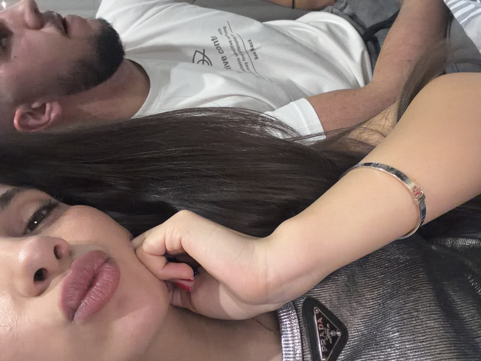 A close-up indoor shot shows two people lying down. A woman with dark hair is in the foreground, her face turned to the camera with her hand near her cheek. She has full lips and is wearing a silver bracelet and a Prada-branded silver garment. Behind her is a man lying on his back, facing away from the camera. He has a dark beard and is wearing a white T-shirt. The location is not discernible from the image.
