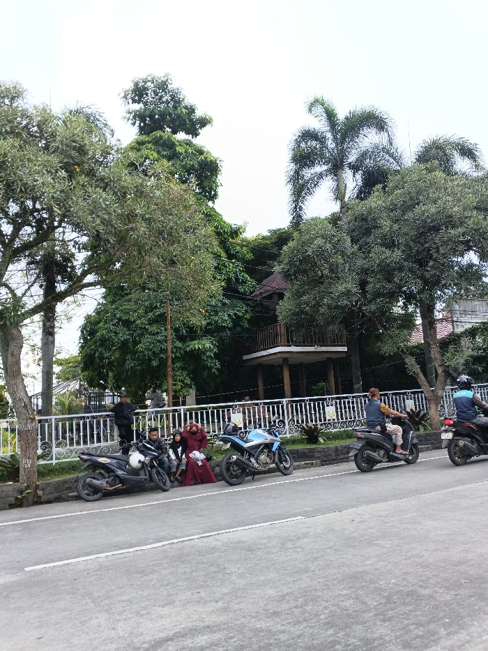 This image depicts a roadside scene in Bien Hoa, Vietnam. The foreground features a two-lane asphalt road with two parallel white lines marking a lane. Two individuals are actively riding motorcycles from right to left on the road: a male in a light blue shirt and beige pants on a dark scooter, and a male wearing a black helmet and a light blue and black jacket on a dark motorcycle. To the left of the road, two motorcycles are parked on a grey concrete curb: a black scooter with a white helmet on its seat, and a light blue sport bike. Four individuals are seated on the curb next to these parked vehicles: an adult male in dark clothing, two children (one in a white shirt, another partially obscured), and an adult female wearing a maroon head covering and dress. Behind the curb, a strip of grass is bordered by a white ornamental metal fence that stretches horizontally across the mid-ground. Beyond the fence, a dense array of tropical vegetation, including multiple large trees and a tall palm tree, covers the background. Partially visible through the foliage is an elevated, open-air structure resembling a pavilion or treehouse, featuring a brown roof, white platform, and wooden railings. Further to the right in the background, a building with a reddish-brown tiled roof is partially discernible. At least two additional individuals are standing behind the white fence on the left side, partially obscured by the trees. The sky above is overcast.