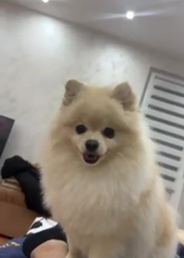 small, fluffy, cream-colored Pomeranian dog sitting on a person’s legs. The dog is looking directly at the camera with its tongue slightly visible. The person is wearing dark socks and blue pants. In the background, there's a wall with a textured surface, some recessed ceiling lights, a television, and a white door with horizontal slats. A black jacket is draped over a brown chair or ottoman. The camera angle is slightly low, looking up at the dog.