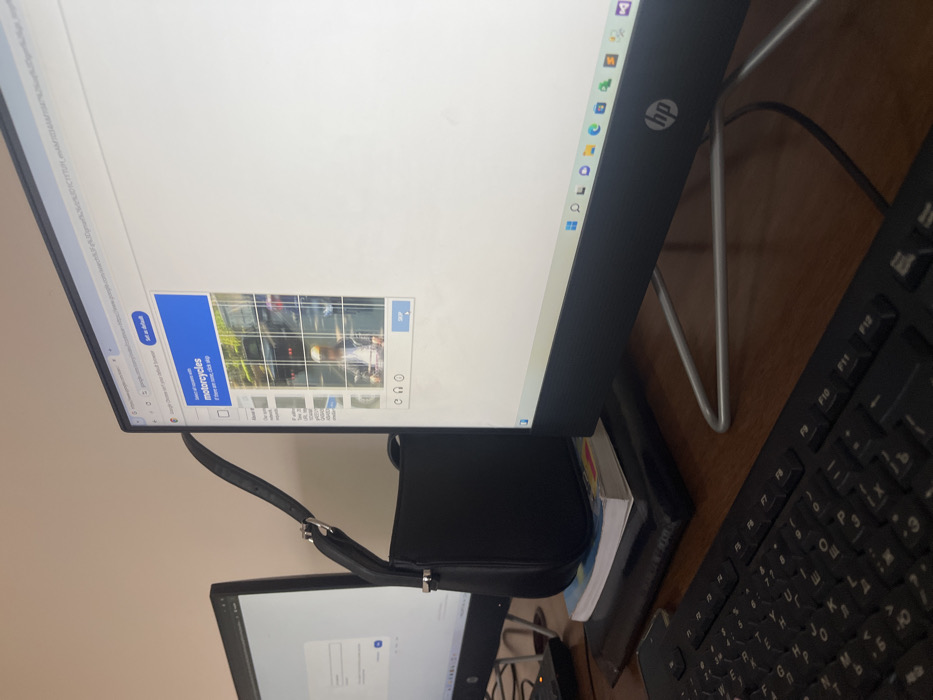 The scene is an indoor workspace in Yerevan, Armenia. Two computer monitors are positioned on a brown wooden desk. The right monitor, an HP model, displays a Google Chrome web browser tab showing a reCAPTCHA challenge. The challenge prompt reads, "Select all images with motorcycles." The reCAPTCHA grid shows multiple image tiles, one of which depicts an individual wearing a helmet on a motorcycle. The Windows 11 taskbar is visible at the bottom of this screen, displaying application icons, including Visual Studio Code. The left monitor, partially visible, displays a generic white login page. Situated between the monitors, a black shoulder bag with silver-colored hardware rests on a small stack, which consists of a multicolored book placed on a dark, flat base. In the immediate foreground, a black wired keyboard, featuring both Latin and Cyrillic/Armenian characters, is visible on the desk. The background consists of a plain, light-colored wall.