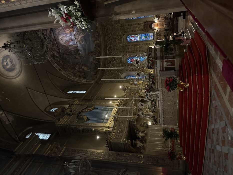 This image depicts the interior of the Basilica Cattedrale di San Giorgio Martire (Ferrara Cathedral) in Ferrara, Italy, specifically facing the main altar and apse from the nave. The scene is illuminated by dim ambient light, supplemented by artificial spotlights and lit candles. In the foreground, five red carpeted steps with gold trim descend from a raised platform. Two potted plants with red flowers, wrapped in gold foil, flank the steps. The visible floor is patterned marble. At the center, the main altar stands on a platform, featuring a white, carved altar frontal. It is adorned with ornate gold and silver candelabras holding tall white candles, some actively lit. Behind the altar, the apse wall is richly decorated with gold relief work and multiple stained-glass windows displaying figures in blue, red, and yellow tones. Above the apse, a large, detailed fresco, likely depicting the Last Judgment, covers a significant portion of the curved wall, featuring numerous figures in a dynamic composition. To the right of this fresco, a large arrangement of white lilies and red flowers rests on a stand. On the left side of the image, an elaborate pipe organ, predominantly gold and white with visible silver pipes, is mounted on a decorated balcony structure. The surrounding walls feature intricate golden architectural details. The vaulted ceiling above includes a circular fresco depicting the Agnus Dei (Lamb of God) holding a banner. A large, multi-tiered crystal chandelier hangs from the ceiling towards the right side of the frame. No individuals are present in the scene.