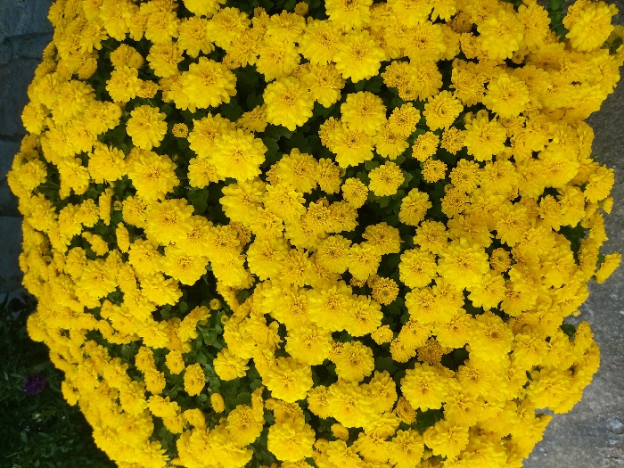 The image presents a close-up, high-angle view of a dense, spherical arrangement of small, bright yellow chrysanthemum flowers. The flowers entirely dominate the central and lower portions of the frame, appearing tightly packed with minimal dark green foliage visible between individual blooms. In the upper left background, a blurred area of dark green plant material, with a faint purple element, is discernible. The bottom and lower-left edges of the frame show a textured gray surface, consistent with concrete or pavement. No individuals, actions, or interactions are present. The specific location within 강화군, South Korea, is not discernible from the visual information provided.