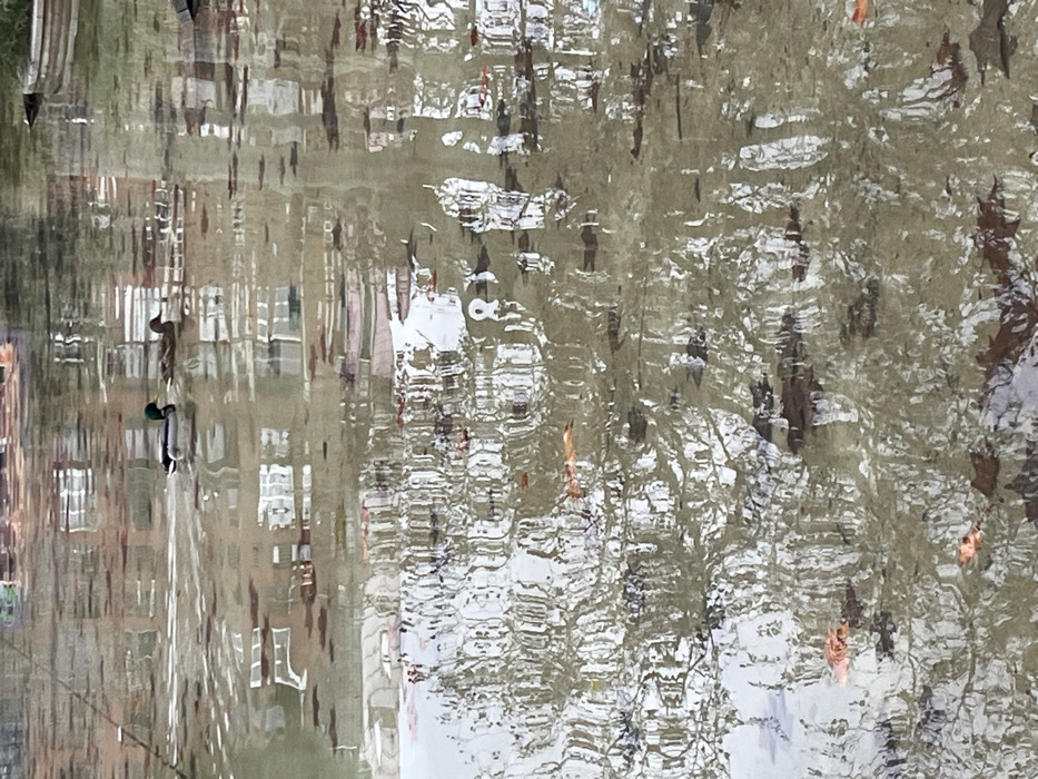 The image displays two ducks swimming on the surface of a light brown, rippled body of water located within the city of Barcelona, Spain. To the left, a male mallard duck is visible with a dark green head, white neck ring, and grey body, followed to its right by a female mallard duck with mottled brown plumage. Both ducks are oriented towards the right side of the frame, generating subtle V-shaped ripples in their wake. The water's surface reflects distorted images of urban building windows and facades, along with bare tree branches, predominantly in shades of white, grey, and brown. Scattered brown and orange fallen leaves are interspersed across the water's surface.