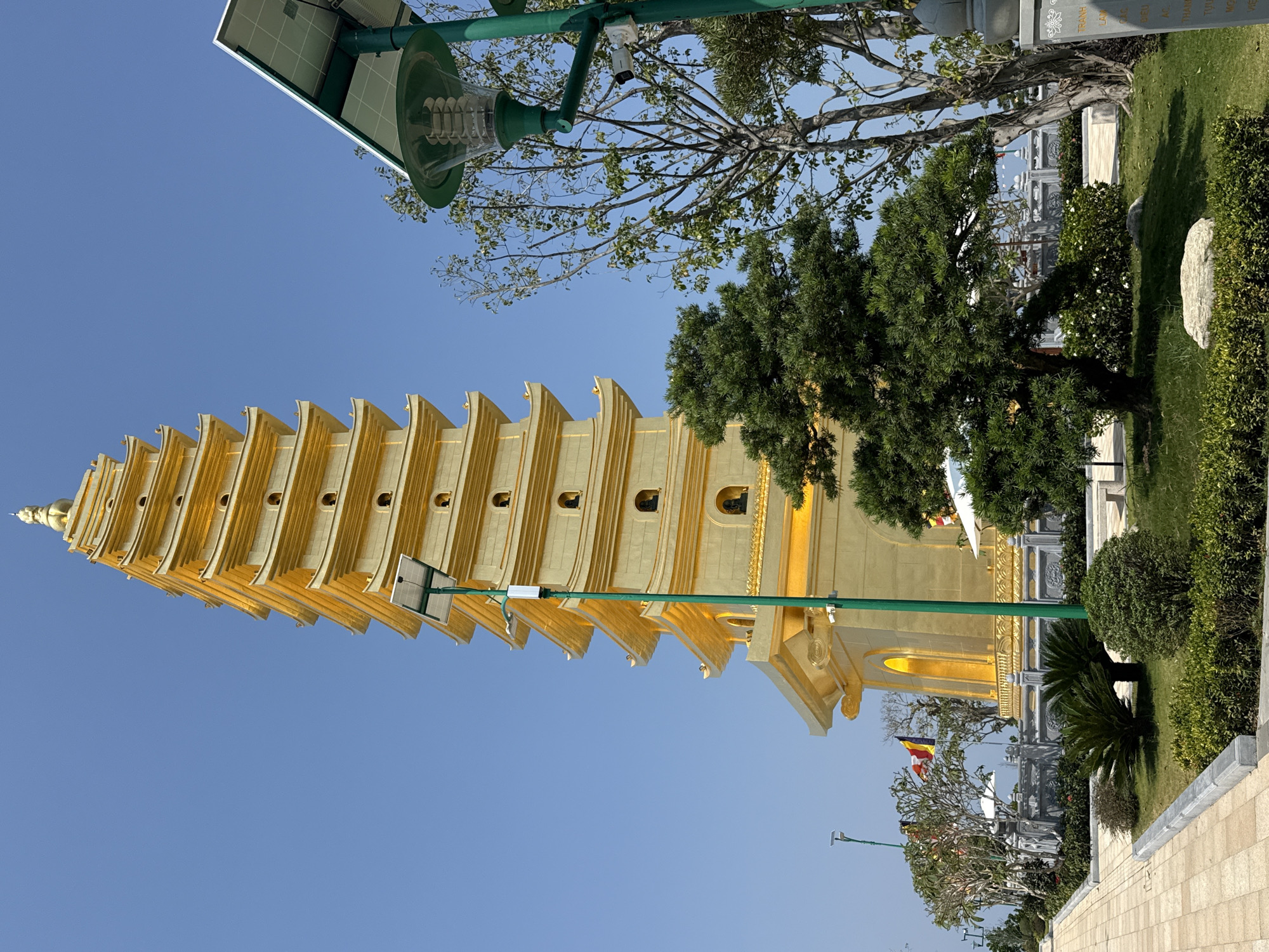 Kim Son Pagoda in Diên Khánh, Vietnam. The tall, golden pagoda is multi-tiered and dominates the frame, standing against a clear blue sky. A green utility pole with a solar panel and street light is visible near the pagoda's top. Lush green vegetation and trees surround the base of the pagoda. A decorative wall or fence is also visible near the base of the pagoda. A flag flies near the ground.