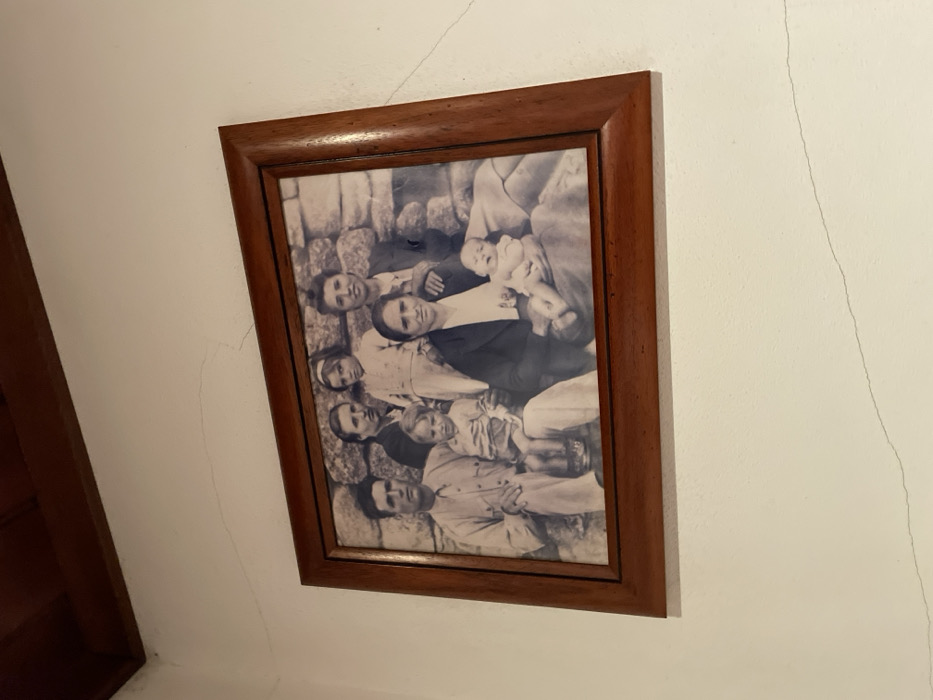 A framed black and white photograph hangs on a white wall with thin cracks. The photo depicts a group of people, including a baby being held. The frame is dark brown and has a simple, slightly rounded design. The photo appears to be old and possibly a family portrait.
