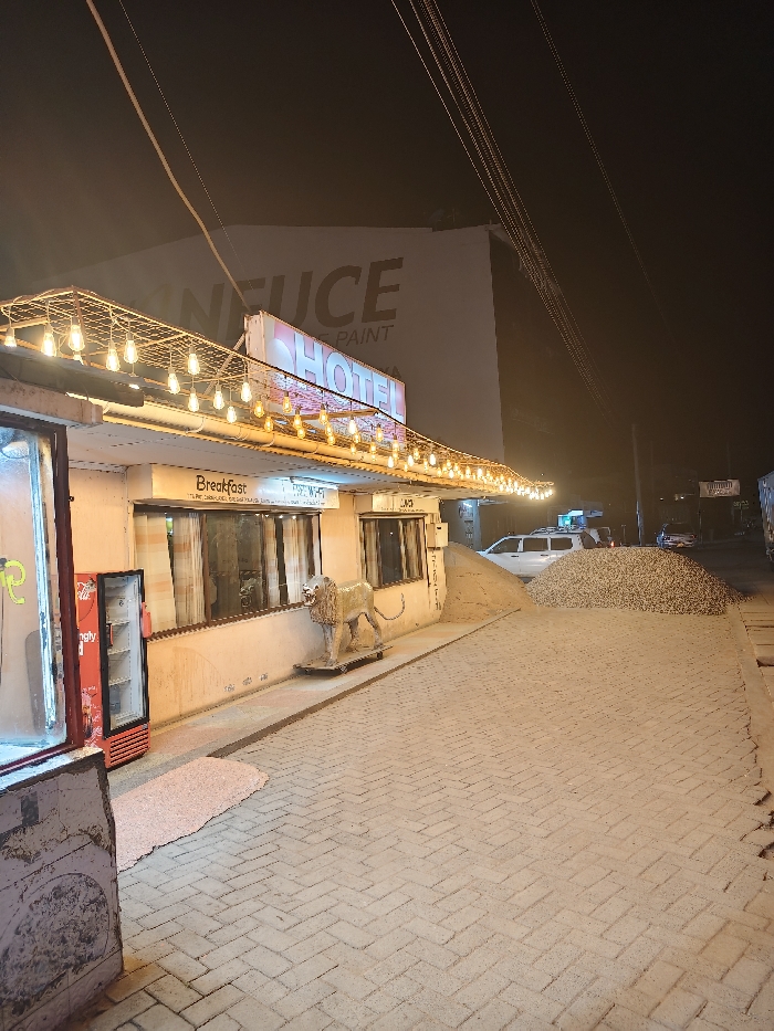 A street view at night features a small hotel or restaurant with "Hotel" prominently displayed on its sign. String lights illuminate the facade and a lion statue stands near the entrance. Next to the building are piles of sand or gravel. Cars and faint signs of other structures are visible in the background under a dark sky with electrical wires crossing overhead.