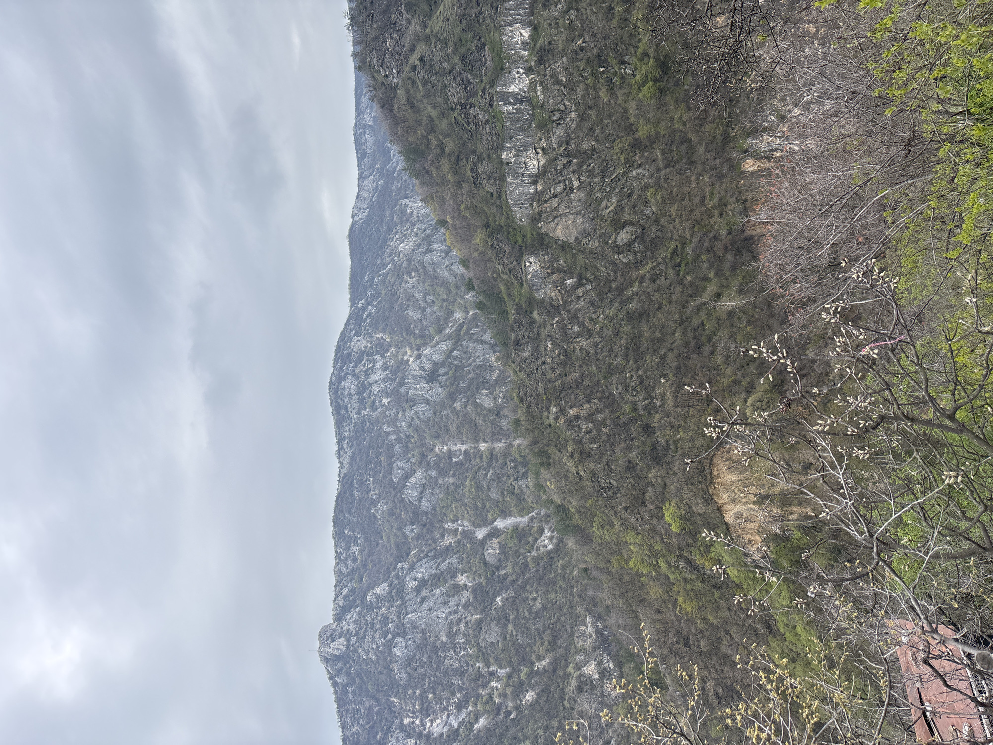 The image depicts a mountainous landscape near Asenovgrad, Bulgaria, under a cloudy sky. The mountain is steep, with exposed rock faces and patches of sparse vegetation. A winding trail is visible on the mountain. In the foreground, tree branches with budding leaves frame the scene. A small building is at the bottom right.