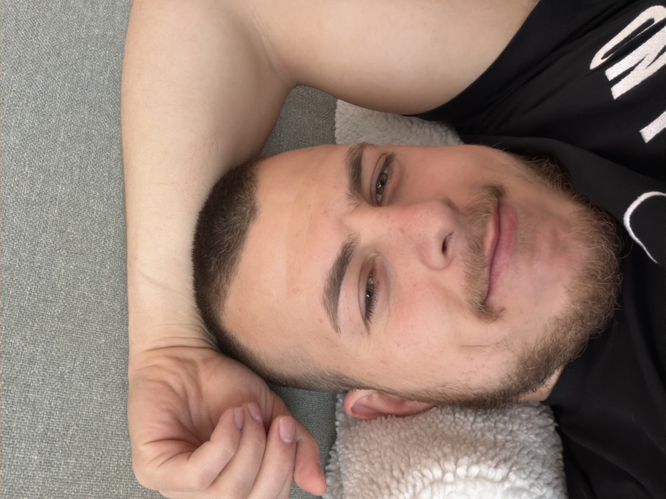 In Malevo, Bulgaria, a close-up, high-angle image depicts an adult male lying on his back. The subject has a light skin tone, a short buzz cut of dark brown hair, and a trimmed light brown beard and mustache. His eyes are open, with the left eye (viewer's right) appearing slightly narrowed. A faint smile is present on his face, showing a dimple on his right cheek (viewer's left). He is wearing a black garment, possibly a t-shirt, with white lettering partially visible on the lower right. His right arm (viewer's left) is bent, with the forearm and hand positioned behind or above his head. His head and part of his arm rest on a textured, off-white, fluffy pillow or blanket. The background above his head and arm consists of a uniform grey, textured fabric surface, likely upholstery. The scene is illuminated by ambient, even lighting.
