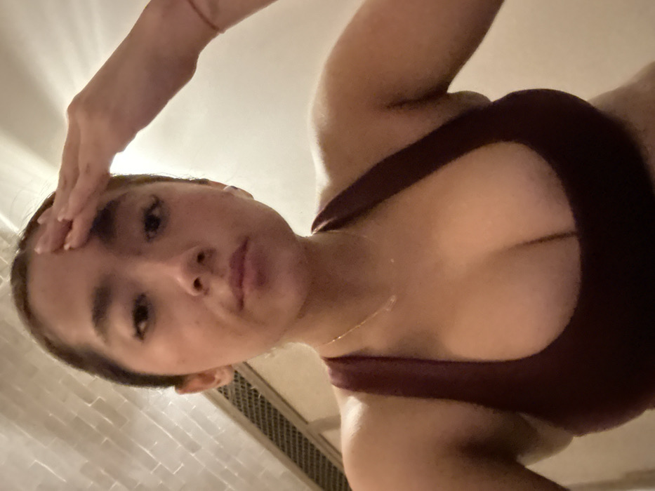 An angled shot of a young woman wearing a maroon sports bra. Her hand rests on her forehead. She is looking directly at the camera. A thin gold necklace is visible. The background includes white textured wall tiles and a decorative metallic vent. The lighting is soft and diffused.