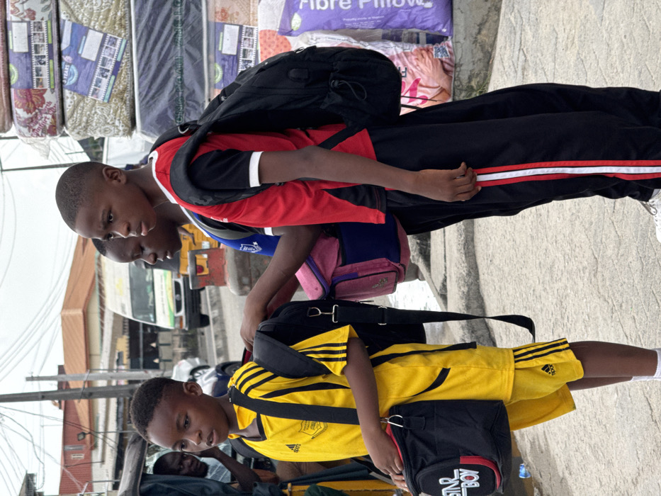 The image captures three boys standing on a paved surface in Badore, Nigeria. The leftmost boy, with short dark hair, wears a yellow and black striped short-sleeved football jersey, matching yellow Adidas shorts, white socks, a black backpack, and a black shoulder bag with "STAR BOY" in white lettering and red trim. He looks towards the viewer's left. The middle boy, partially visible, has short dark hair and wears a blue top, carrying a pink and blue backpack; his right hand is near the backpack of the boy to his right. The rightmost boy, with short dark hair, wears a red and black short-sleeved shirt, black track pants with red and white side stripes, and a black backpack; he looks towards the viewer's right. In the background, an adult male is partially visible to the far left. The urban environment includes a white commercial bus, a partial yellow tricycle, and other vehicles on a road behind the boys. To the right, mattresses and pillows are stacked, wrapped in plastic, indicating a commercial area. Utility poles and overhead wires are visible against a light sky.