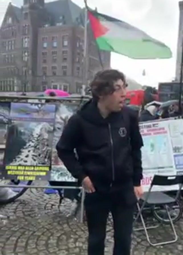 In a city square with gray herringbone-patterned pavement, a man in a red-and-black jacket and gray jeans stands beside a display of posters. The posters, mounted on a wheeled frame, contain images and text related to the Israeli-Palestinian conflict. A Palestinian flag stands behind the posters. Other people are visible in the background, some holding umbrellas. In the background, a large building with a tower is visible. The sky is overcast.
