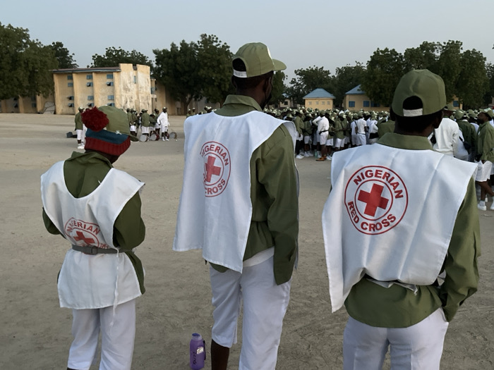 A group of individuals wearing olive green shirts and white trousers, adorned with "NIGERIAN RED CROSS" vests, stand in a sandy field