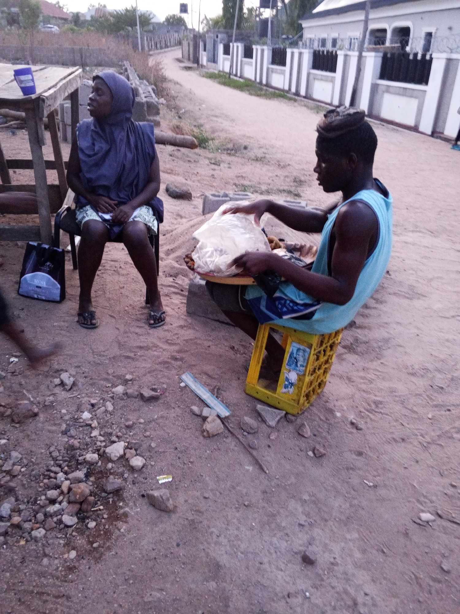 The scene depicts two individuals in an outdoor setting, likely a street or roadside in Adonkolo, Nigeria. A woman wearing a blue head covering and a patterned short skirt is seated on a black plastic chair next to a wooden table. Her posture suggests she might be a customer or observer. A blue plastic cup is placed on the table. Beside her is a black bag on the ground. To the right, a dark-skinned man is seated on a yellow plastic crate. He wears a blue tank top and short pants with a pattern. He is holding a tray covered with a clear plastic bag, likely containing food items for sale. His attention is directed towards the tray's contents. The ground is mostly dirt and gravel, with scattered rocks and debris. A wooden stick and piece of metal lies between the two figures. In the background, a dirt road stretches into the distance, flanked by houses and vegetation. The light suggests it's either early morning or late afternoon. A single visible electrical pole stands in the distance.