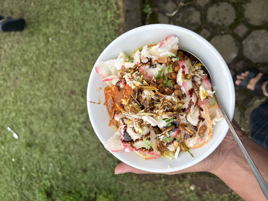 A bowl of chicken porridge is held in someone's hand. It is topped with rice crackers, shredded chicken, peanuts, and a dark sauce. A spoon is in the bowl. The background consists of grass, some stone tiles, and a pair of sandals.