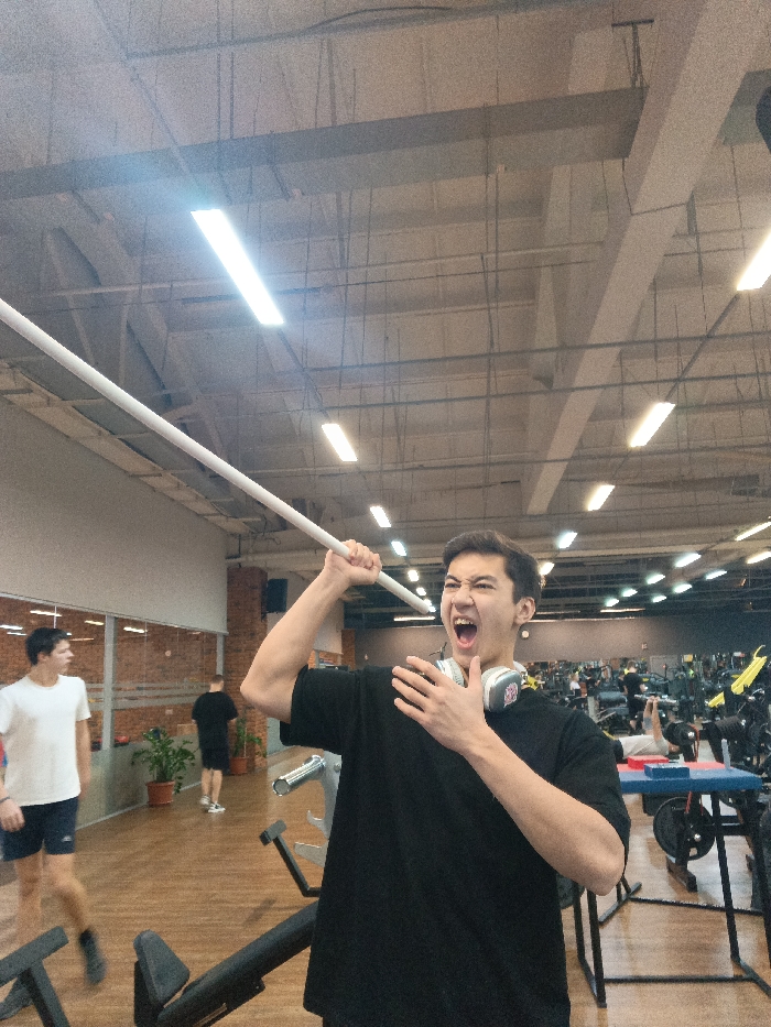 The image depicts an indoor fitness center or gymnasium located in Chaikovsky, Russia. In the foreground, a young adult male with medium-dark hair is positioned centrally, facing slightly right and looking upwards. He wears a black short-sleeved t-shirt and a pair of light-colored over-ear headphones with red accents rests around his neck. His right arm is raised, hand gripping a long, thin white pole extending diagonally upwards out of the frame. His left hand is placed flat against his chest. His mouth is wide open in an expressive shout or yell, and his eyes are squinted. In the mid-ground to the left, another male in a white t-shirt and dark shorts walks towards the left, partially blurred. Further back, near a brick wall section, a third male in a black t-shirt and dark shorts walks away from the camera. The background reveals a spacious gym area with numerous exercise machines, weight racks, and benches. A person is visible lying on a bench on the far right, and another is seated at a blue-topped arm wrestling table. The environment features a light-colored, possibly wooden, floor. A section of exposed red brick wall is visible on the left, alongside large reflective glass partitions that show reflections of the gym interior. The high ceiling is industrial in style, with exposed structural beams, conduits, and evenly spaced rectangular fluorescent or LED light fixtures providing illumination. Several potted plants are placed near the brick wall. The overall scene suggests an active gym environment with the main subject engaged in a dramatic pose or action.