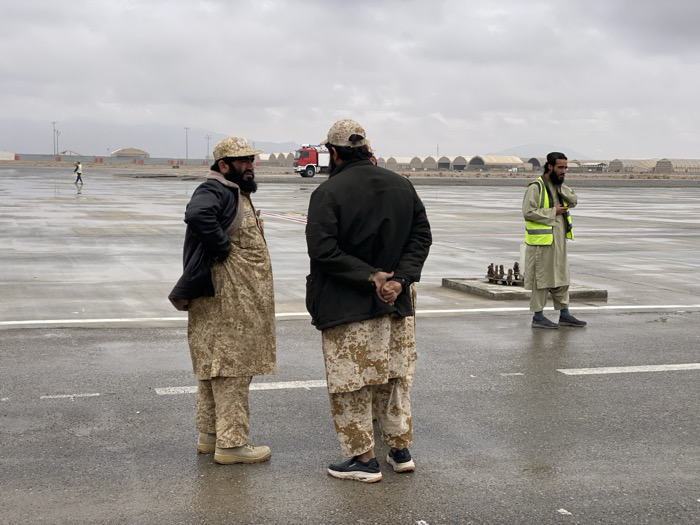 An outdoor scene depicts an airfield tarmac in Unknown, Afghanistan, under an overcast sky. The dark asphalt surface is wet and reflective, with visible white and red painted lines. Three men are prominent in the foreground and midground. In the foreground left, a man with a black beard wears a tan camouflage *shalwar kameez*, a matching baseball cap, and a black winter jacket, facing right and looking towards the center. Next to him, a second man stands with his back to the viewer, wearing similar tan camouflage trousers and a dark jacket, with a matching baseball cap and hands clasped behind his back, facing slightly left. In the midground right, a third man with a black beard stands facing left, wearing a light-colored *shalwar kameez* beneath a high-visibility yellow-green vest, holding a dark object in his hands. A concrete pedestal with metal fixtures is visible near the third man. In the distant background, a red fire truck is positioned on the tarmac, and a series of arched, hangar-like structures line the horizon, with distant mountains visible beneath the cloudy sky. A lone figure is walking in the far left background.