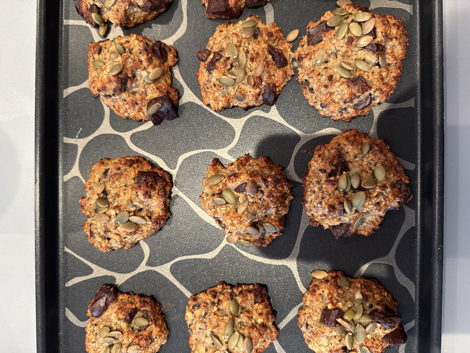 The image displays a black rectangular baking tray containing eleven irregular, roundish baked items, likely cookies or oat drops, arranged in rows. Each item exhibits a golden-brown, textured surface composed primarily of rolled oats, interspersed with dark chocolate chunks and topped with numerous light green, elongated pumpkin seeds (pepitas). The baking tray features a dark gray, non-stick surface with an abstract, light gray organic pattern resembling interconnected irregular shapes. The tray rests on a light-colored, possibly white or off-white, textured surface, likely a kitchen countertop or table. No individuals are present. No specific actions or interactions are depicted beyond the static arrangement of the baked goods on the tray. The environment appears to be an indoor domestic setting. There are no visual cues within the image to indicate its specific location within the city of Wattrelos, France, or any other geographical area.