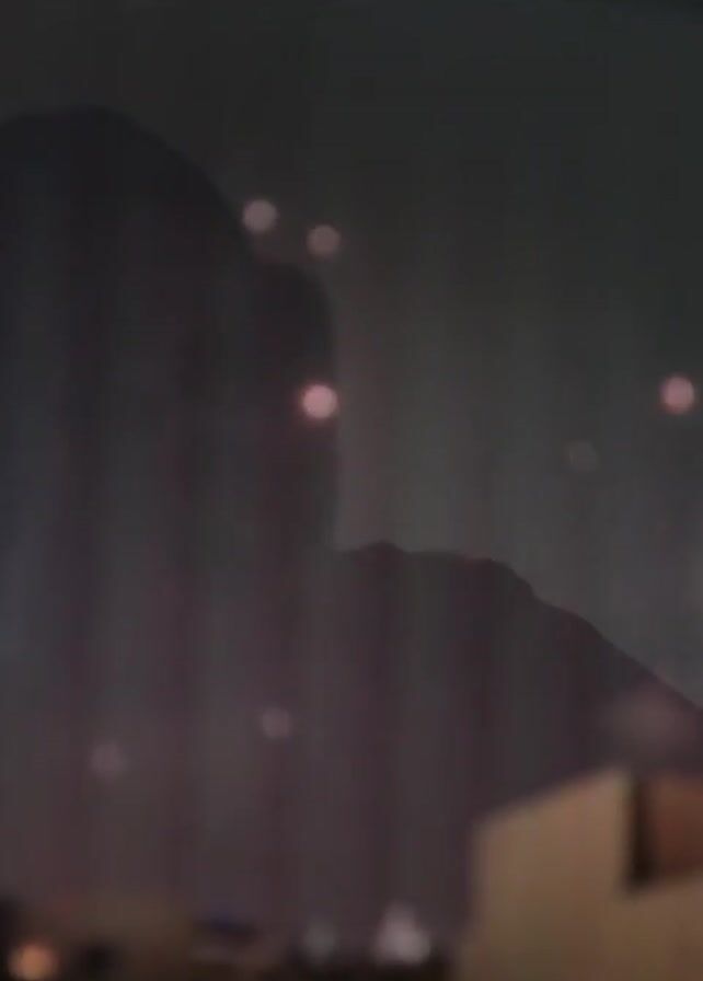 blurry, dark figure against a slightly lighter background, with several small, bright, reddish-orange lights scattered around