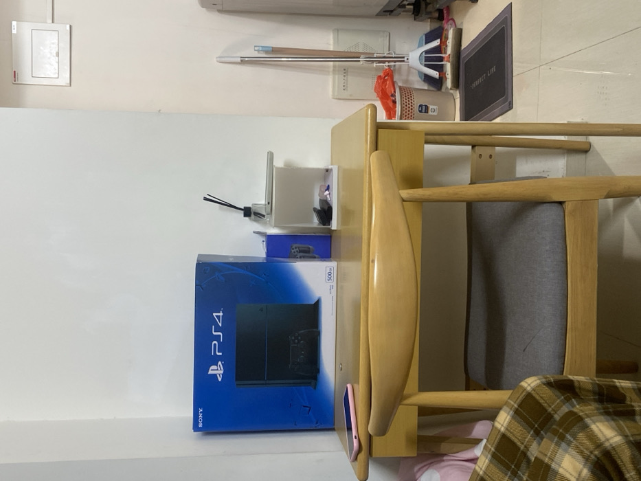 The scene depicts an interior room corner. The specific location within Huangpu District, China, cannot be determined from visual information. In the foreground, the back of a light-colored wooden chair with a curved top rail and a grey upholstered seat is visible, positioned at a matching wooden desk. A brown and beige plaid garment is partially visible on the far left. On the desk surface, from left to right, a pink-cased smartphone lies face-down. Centered on the desk is a large blue retail box for a "SONY PS4" console, indicating "500 GB." To its right, a smaller blue box is partially visible. Further right, a black-capped reed diffuser with several black reeds stands on a clear rectangular base, next to a white, open-cube-shaped organizer containing small, indistinct items. The left wall is plain white. The adjacent wall, painted light beige, features a white electrical distribution box mounted high up. Below this, a mop with a blue handle and a white roller head is leaning against the wall alongside a brown-handled broom. A white plastic waste bin, containing a red plastic bag, is positioned to the right of the cleaning tools. A rectangular grey floor mat with the partially visible text "ENJOY LIFE" lies on the light-colored tiled floor in front of the cleaning supplies. A white rectangular vent or grate is situated on the beige wall near the floor. To the far right, metallic legs of an unseen appliance or furniture item are partially visible. No individuals are present. No explicit actions or interactions are depicted.
