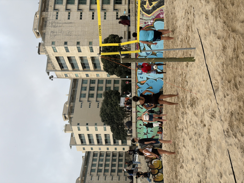 The image displays a sandy beach area in Matosinhos, Portugal, under an overcast sky. In the foreground, a sand court is delineated by boundary lines, featuring a yellow volleyball net branded "COPAYA" stretched between a wooden and a metal pole. Seven individuals are present on the sand. On the left side of the net, a female in a white tank top and dark shorts faces right, a male in a black t-shirt and dark shorts faces right, and a female in a white crop top and denim shorts faces forward. On the right side of the net, a female in a black dress stands with her back to the viewer, hands on her hips. A male in a red t-shirt holds a black and white soccer ball with both hands, positioned behind the net. Another male in a light blue sleeveless top stands with his back to the viewer, also behind the net. These individuals are positioned as if participating in or observing a beach sport. Behind the sand court, a low concrete wall is extensively covered with multi-colored graffiti, featuring shades of blue, green, yellow, and black. Above this wall, a concrete promenade or elevated walkway is visible, populated by several individuals standing or seated on steps. Small, dense green trees are planted along this elevated area, along with a partially visible sign indicating "ENTRANCE AQUI". In the background, multiple multi-story residential buildings with a light beige/off-white facade and numerous rectangular windows and balconies line the horizon. Streetlights are present on the promenade and on the rooflines of some buildings.