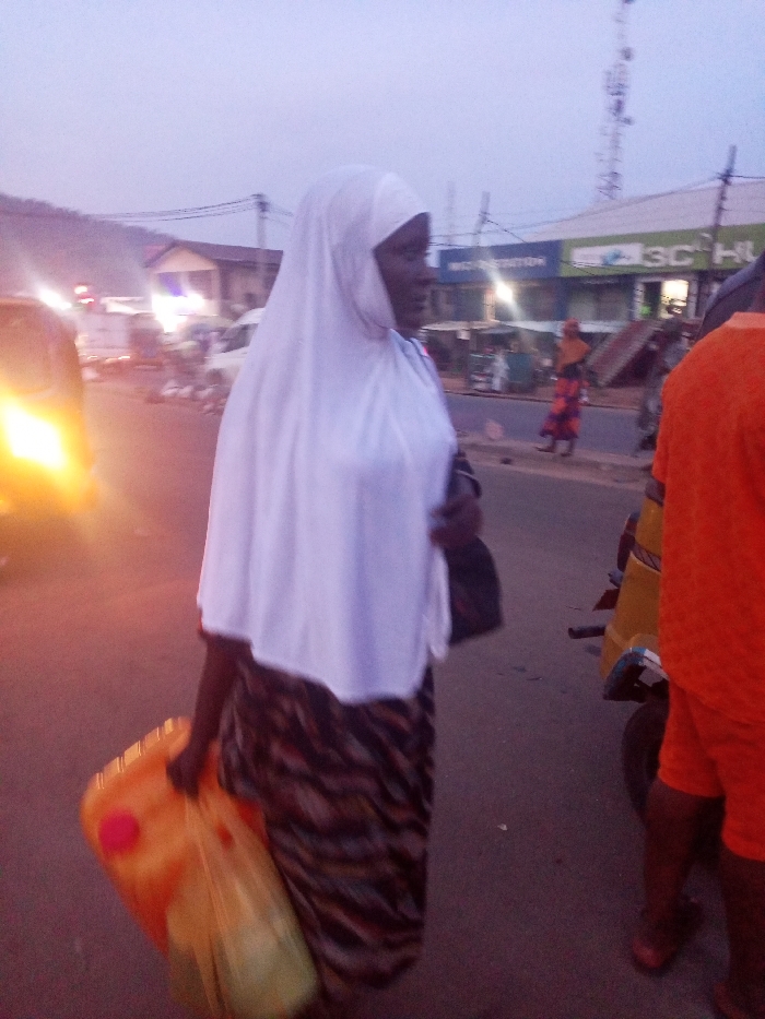 A woman wearing a white headscarf and patterned skirt walks along a street carrying a yellow container. To the right of the woman, a person in orange shorts stands next to a yellow motorized vehicle. In the background, several buildings are visible. One building features an advertisement for "3C HU." Utility poles with wires extend into the sky. The lighting suggests it is either early morning or late evening.