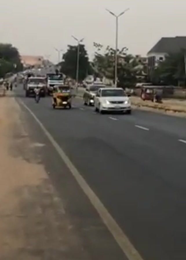wide shot of a road with cars, motorcycles, and auto rickshaws (tuk-tuks) moving along it. There are two large trucks, one white and the other pink and white, driving down the road. A man is riding a motorcycle in the same direction as the other vehicles. There are street lights along the side of the road, and buildings and trees can be seen in the background. The sky is overcast. There are pedestrians along the road near the trucks.